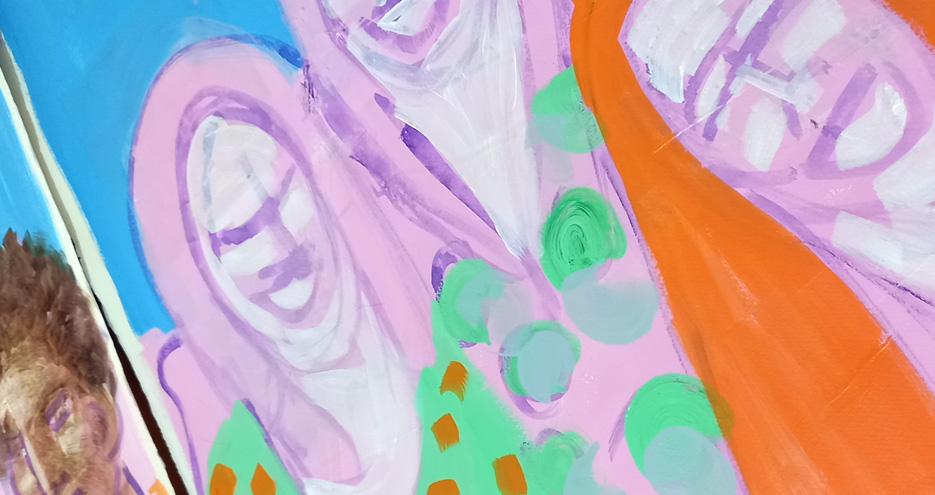 I carried on with my large paintings on paper, 5 at the same time. I worked on top of the pink foreground I’d blocked out with a Dioxazine Purple wash, sketching in faces and bodies of women and girls, in threes, triples. It’s a very basic starting point. I’m working entirely from my imagination, noContinue reading “The Triples.”