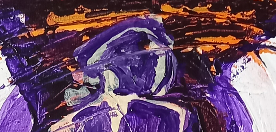 I finished scraping a layer of Dioxazine Purple (transparent) over the bulk of my nocturne with a palette knife. When it dried, I started to sketch in some figures with Unbleached Titanium (opaque). I’m using Liquitex Heavy Body acrylic paints over a recycled and heavily textured stretched canvas. Still a long way to go ….