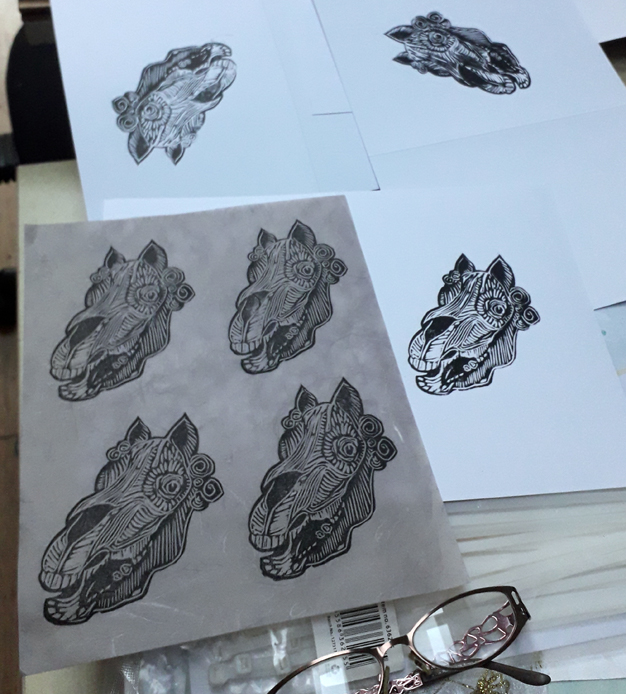 I wasn’t feeling too well yesterday so didn’t do much of anything at all but I bounced back today with my two Mari Lwyd projects. I printed my lino block, in black Caligo Cranfield Safewash relief ink, individually onto white card and then in blocks of four onto A4 sheets of hand made paper madeContinue reading “A Mari Lwyd Day”