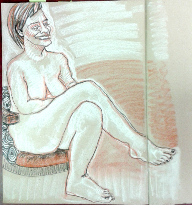 Just back from life drawing at Swansea Print Workshop. I did a couple of drawings, this is a 10 minute study in white and sanguine conté crayon into an A3 brown paper sketchbook from Seawhites of Brighton. It’s late and I’m going to bed now. Good night zzzzzzzzzzzz