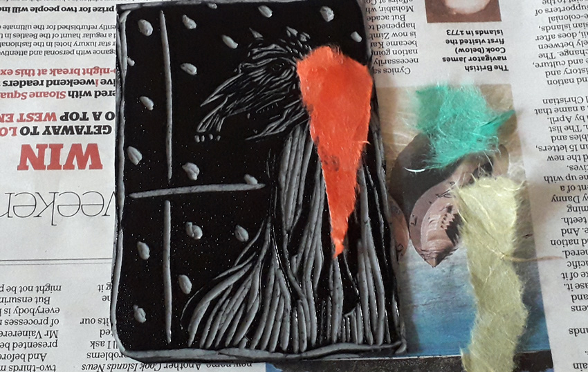Here’s an unusual view of a Mari Monotype, it’s all set up before I took the print. I inked an acrylic sheet, did the drawing of the Mari Lwyd onto it with cotton buds and brushes, and then laid some pieces of mulberry paper onto the surface to act as chine collé. This is theContinue reading “A Month Of Maris #15”