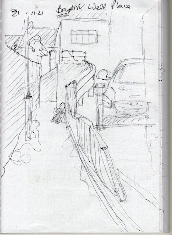 Here’s a quick scribbly sketch from one of my wanderings around Waun Wen and this little bit of street has a dark, narrow drangway going off to the left and a very wobbly set of railings, bashed by a car, facing me in the middle of the sketch. A drangway is dialect from the SouthContinue reading “Wobbly Bits And The Drangway”