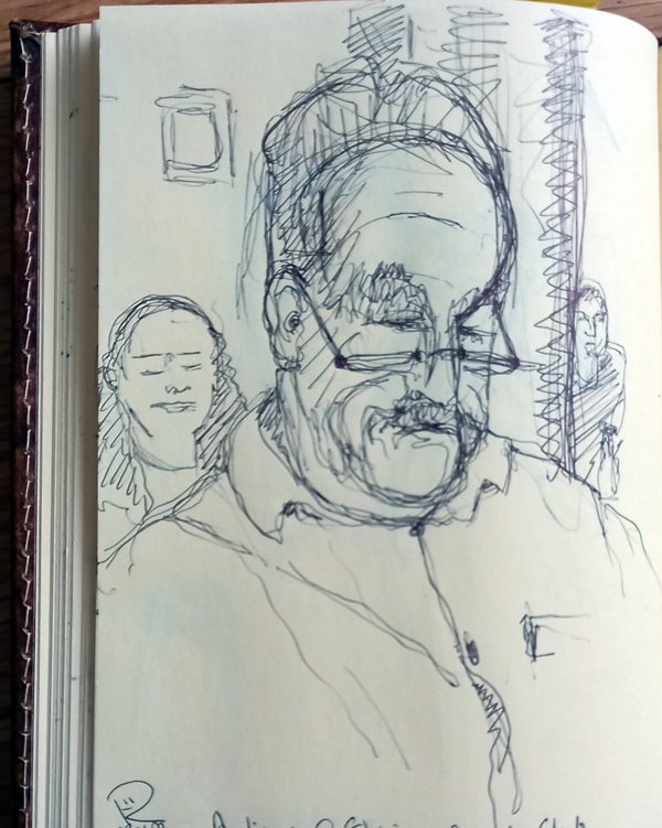 Here’s another quick sketch when I was out and about. This time, I tried scribbling someone who was talking. It’s good practice as I have to cope with a face in constant motion. I used a ballpoint pen into my A5 leather-bound sketchbook. Raising Funds. My family is raising money for Phil, a younger relativeContinue reading “Face Across A Room – 4.”