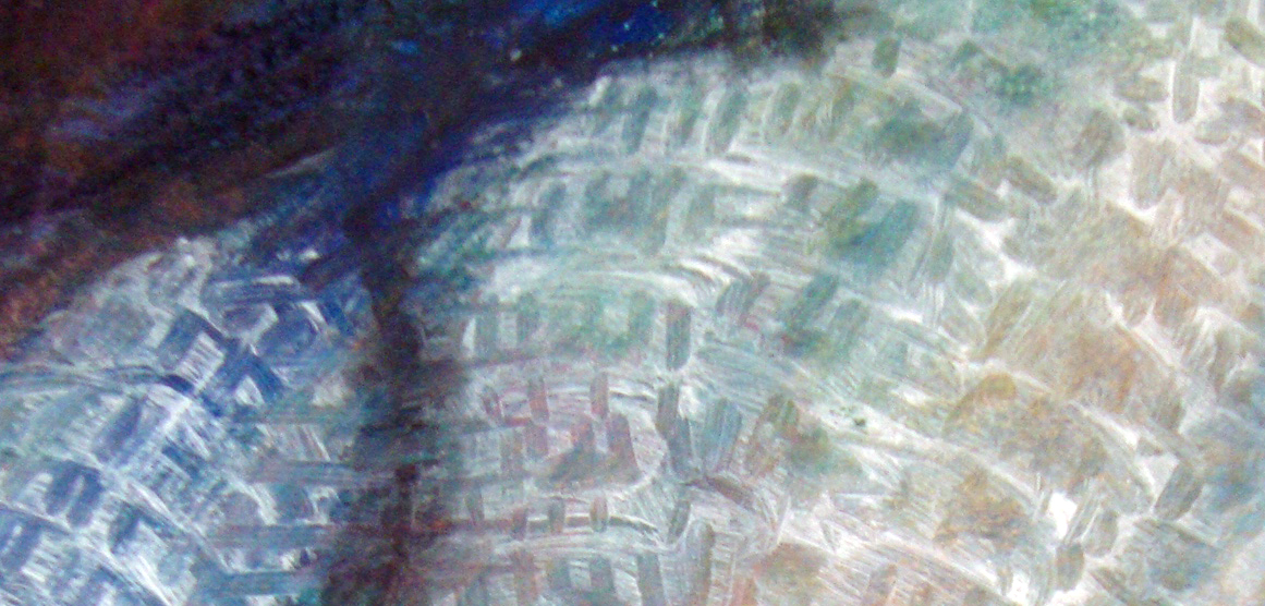 I was experimenting with acrylic paints onto stretched paper, laying down some base colours with brushes then, when they’re dry, overlaying a coat of white acrylic and working into it with a cotton bud (Q-Tip) while it’s still wet. It gives a really interesting 3D effect.
