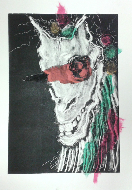 I’ve been working away at Swansea Print Workshop since I finished two evenings of sketching with the Coppertown Mari Lwyd last week. I decided to develop my drawings into print and chose a fairly simple reduction monotype technique, with chine collé, as my starting point. This is the first. There is usually a period ofContinue reading “Menace And Monotype”