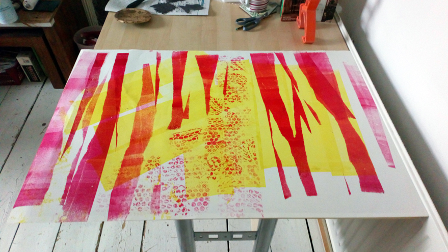 I’ve been doing some experimental printmaking onto some donated vintage paper the past few days and when I was cleaning up after the first day, where I used yellow ink, I rolled my roller onto a large piece of paper to get the excess ink off. The next day, when I used red ink, IContinue reading “A Happy Accident”