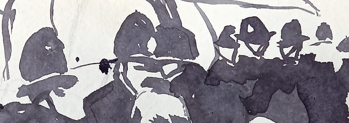 I’m doing some drawings for my next lino-print and today I was playing around with composition – just a quick brush and wash sketch to group lights and darks. I need more practice with police helmets!