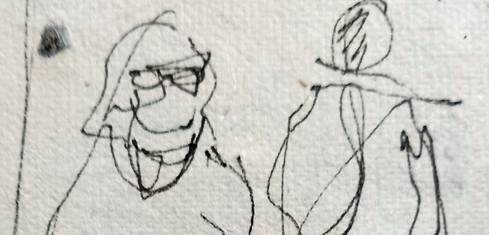 A quick scribble at the pub quiz the other evening, with a Faber Castell Pitt drawing pen into my little leather-bound sketchbook.