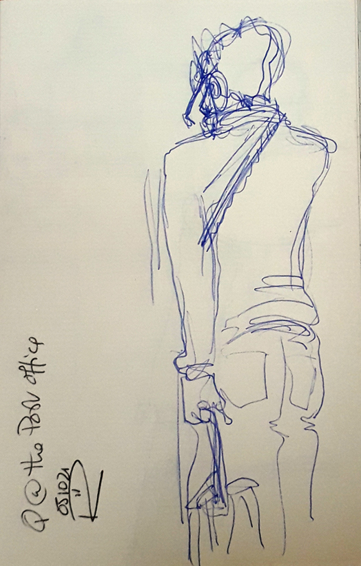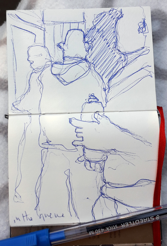 Some more queue drawings. It’s getting to be a good place for sketching now. Faces with masks are new and something I haven’t had a chance to draw before. The queues I’ve been in have mostly moved reasonably quickly so I have to be really fast drawing people. I can be a bit more leisurelyContinue reading “Mask And Mosque”