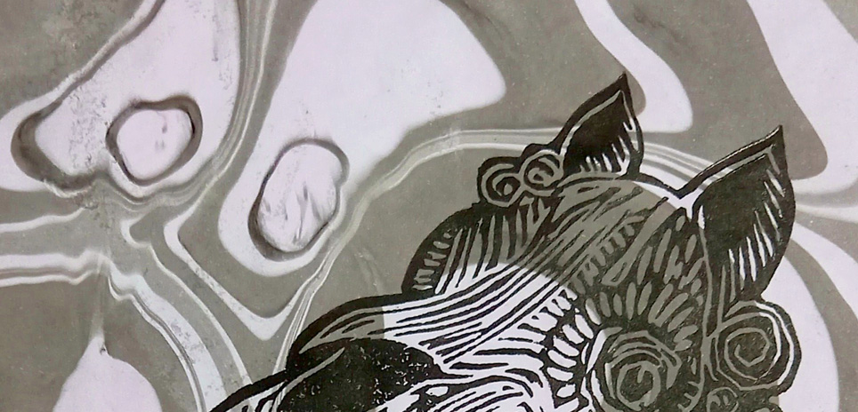 I used my little Mari Lwyd lino block in three ways during my one-day residency at The Workers Gallery in the Rhondda Valley. First, to print onto a cotton shirt, then overprinting on top of circular monotypes, and finally I printed the block on some marbled papers I had made a few months back. IContinue reading “Marbled Mari: 1”