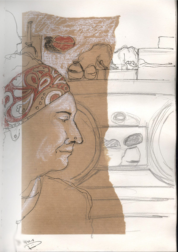 A sketch of a friend relaxing in a chair, using sanguine and white conté crayons and a Faber Castell Pitt drawing pen, size M into my A4 hardbacked sketchbook that I had previously prepared with pieces of brown wrapping paper stuck in with Pritt gluestick. Relaxed pose, relaxed drawing.