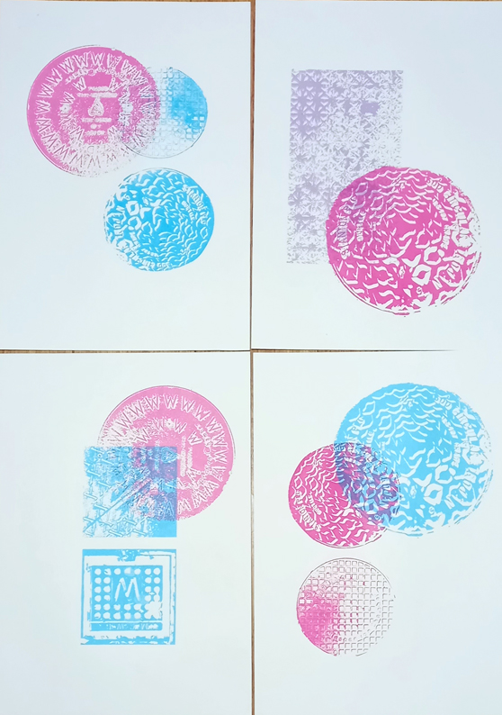 A quiet but productive afternoon in Waun Wen community centre today, continuing with my screenprint series based on images of local manhole covers from original photographs by Melvyn Williams. I mixed Daler Rowney System 3 acrylic paint, Process Magenta, into screenprint medium and overprinted the Process Blue images I did a few days ago. WhereContinue reading “Colour Overlap.”
