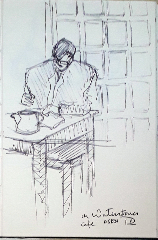 I was sitting quietly, sipping coffee and watching others sitting quietly, sipping coffee and reading and writing, in Waterstones Café in Swansea. Ideal conditions for sketching people. So I did. Ballpoint pen into an A6 sketchbook.
