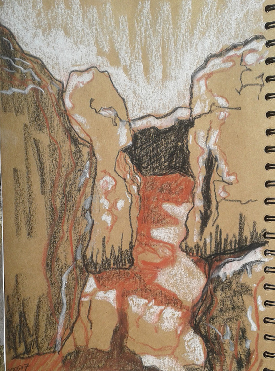From the burial chamber near the magnificent beach at Three Cliffs, we headed inland to Parc le Breos to visit another Cotswold Severn tomb. It’s much more complex than most of the tombs we’ve visited, it’s quite big really, almost a metropolis and it was difficult to work out where to start my sketch. SoContinue reading “Neolithic Metropolis”