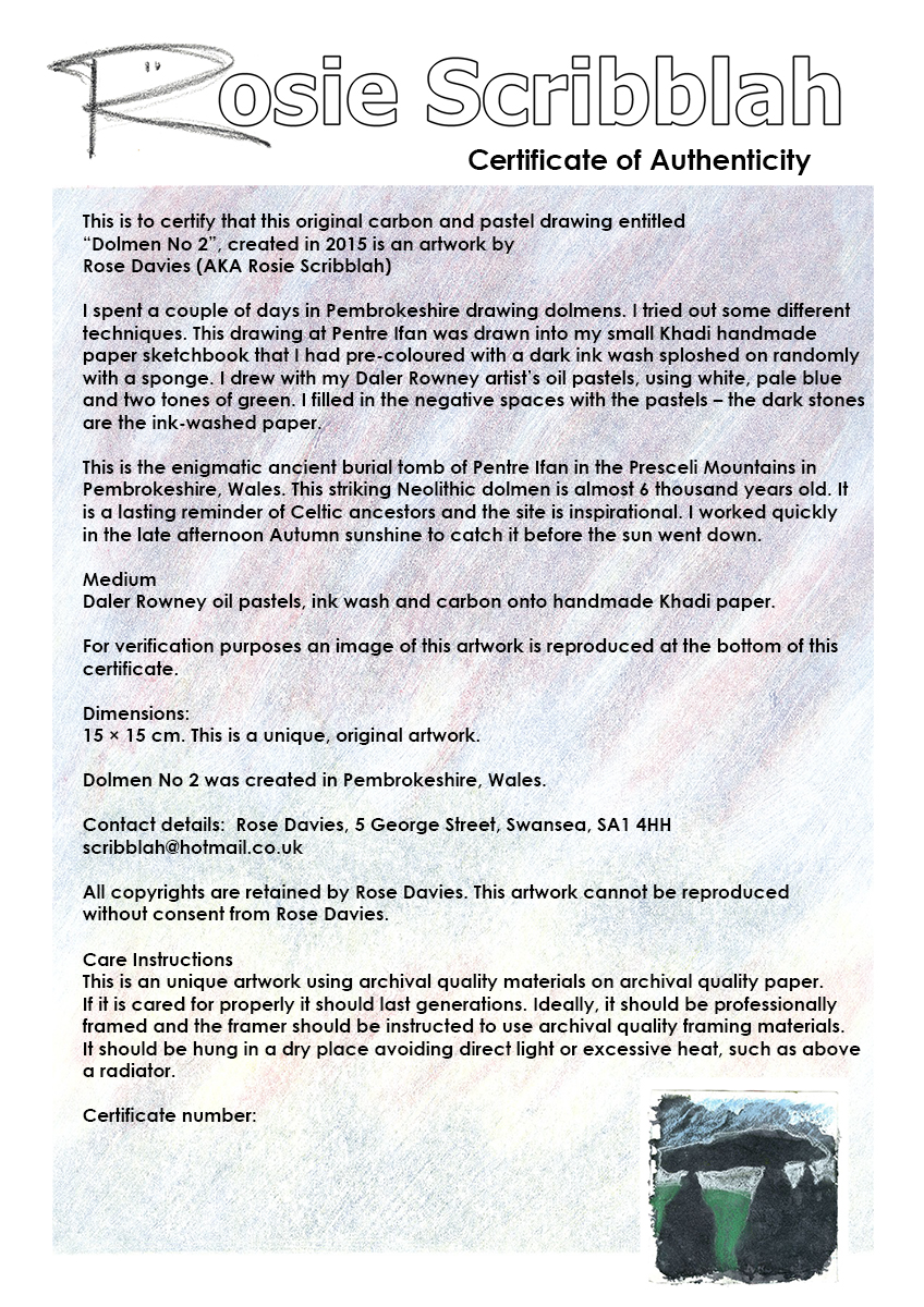 So that you know it’s by and from me I include a certificate of authenticity. This features a description of the artwork, including some of my thoughts about my inspiration as well as details of the materials used and instructions for how to care for it.