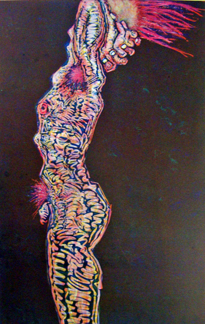 I draw from life weekly at Swansea Print Workshop, working with a range of professional artists and models of all ages and shapes including a young male serving soldier and a retired female scientist covered in tattoos. Life drawing underpins my artistic practice and inspires me to develop the images into other genres, especially this monotype process which is an advanced and complex method of producing a unique artwork.