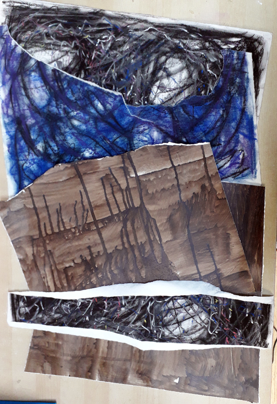 I added a couple of pieces of vintage W. H. Saunders paper that I had screenprinted with some small drawings from my sketch books – I didn;t like them so I scribbled over and over with chalks, charcoals and soft pastels.